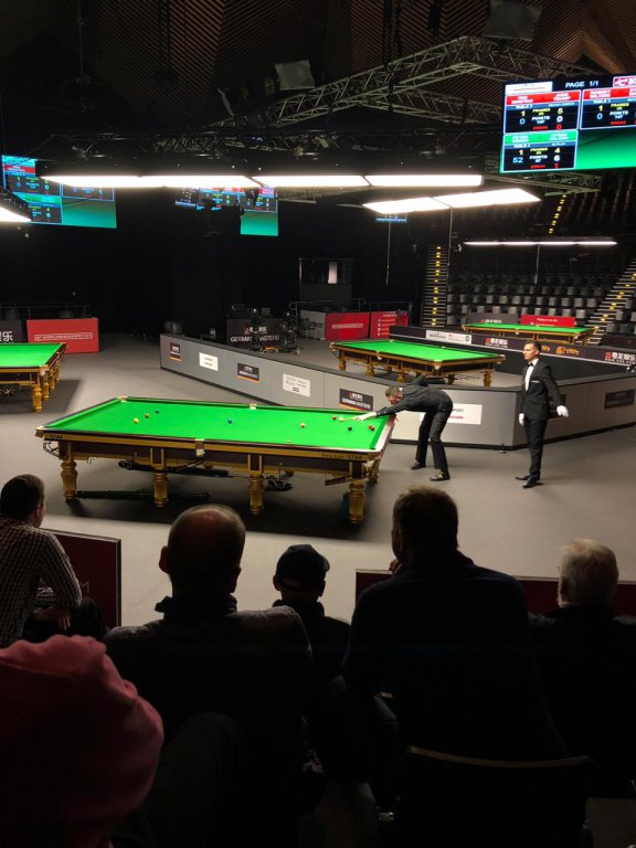 На матче Вильямса с Беном - тетка ( иначе не скажу) постоянно путала расстановку цветных шаров – зеленый не ставился, она стала его лепить пониже его отметки (ну правильно, если все остальное занято) прилепила! Виль спокойно так смотрел на ее потуги, не мешал))) а потом сказал что синяя отметка свободная)))) вообщем забивает Марк красный, освобождая зеленую точку, забивает зеленый… она его вытаскивает и ставит на прежнее синее место… и это почти без зрителей. В это время играли Трамп с МакМанусом, Мерфи с Селтом и Дотт с Алленом на трех основных столах и все фавориты проигрывали, народ там был. Матчи у них закончились одновременно и толпа к нам с Вилем рванулась. Тут уж тетку совсем затрясло – то шарик уронит, то пульт на столе оставит. Ой-ё….