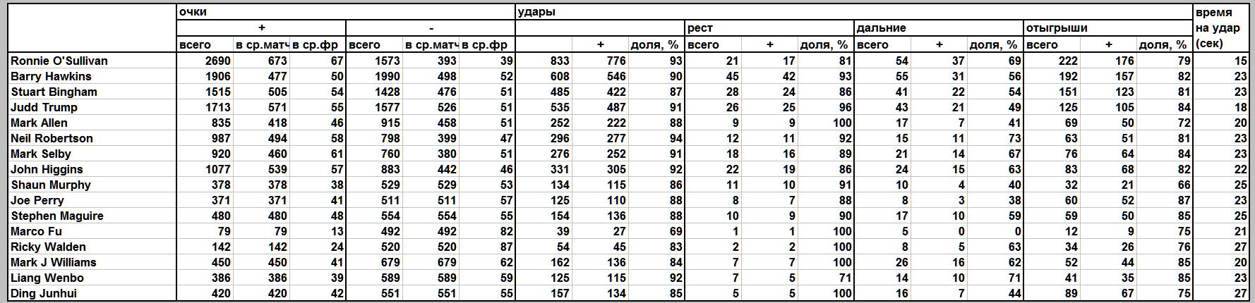 Сенчури: 26 (14о - Джадд Трамп) Матчей: 15 Фреймов: 139 Контр-матчей: 2